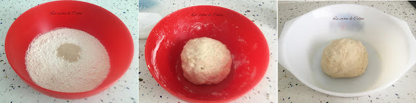 Ponemos la harina en un bol grande y desmigamos encima la levadura fresca mas o menos en el centro. Añadimos el aceite y el agua y mezclamos todo bien, añadimos la sal y seguimos amasando durante diez minutos con movimientos firmes. Formamos una bola, la ponemos en un recipiente con tapa y dejamos levar durante una hora y media.