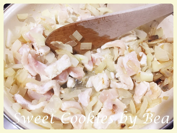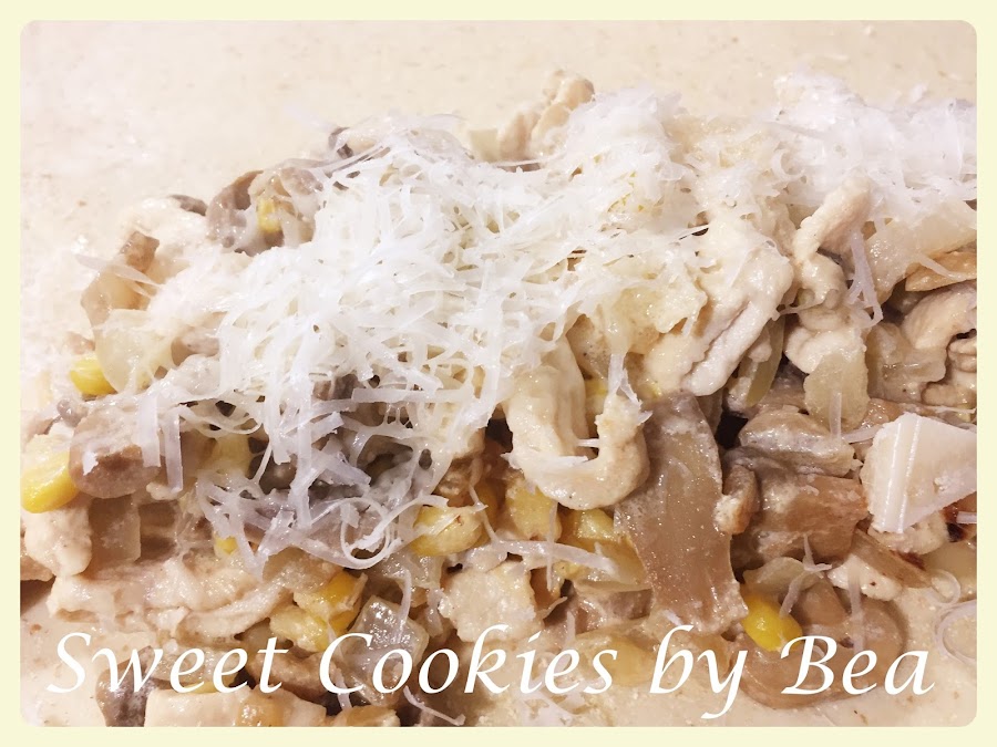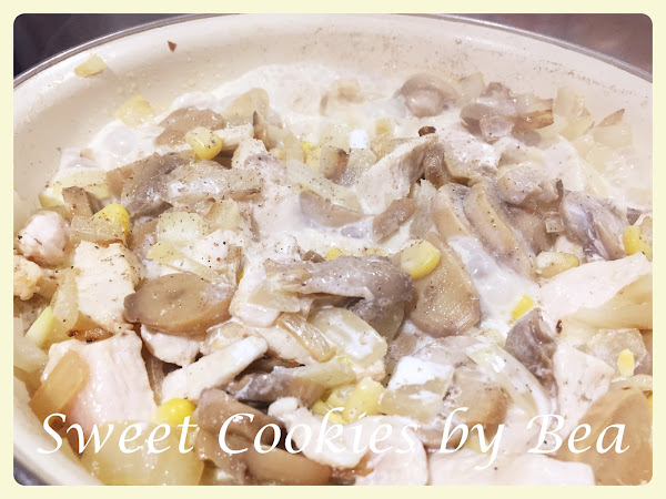 Cuando esté hecha le añadimos el reto de ingredientes (maíz, champiñones...lo que se nos ocurra de verdura)en este momento es cuando añadimos la carne (troceada) que teníamos hecha a la plancha que sobró en otra comida, ese filete seco (si es nuestro caso) y le ponemos la nata (crema de leche), mas o menos como medio vaso, unos 100 ml, no mucha simplemente para darle un poco de jugosidad