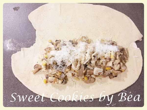 Con la masa estirada ponemos el relleno y no olvidarse del quesito rallado