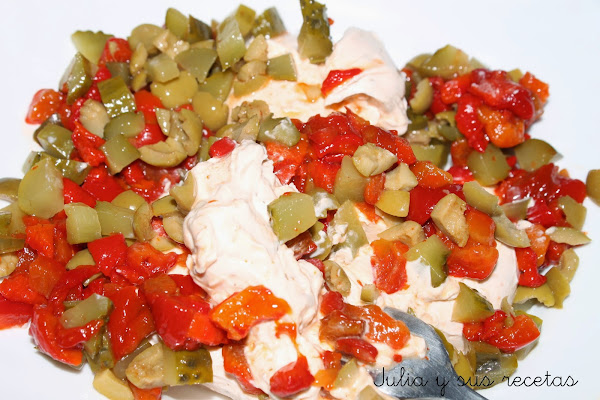 Picamos muy finitos los pimientos, las aceitunas , el huevo y los pepinillos. Los mezclamos con el queso y la mayonesa. Lo reservamos.