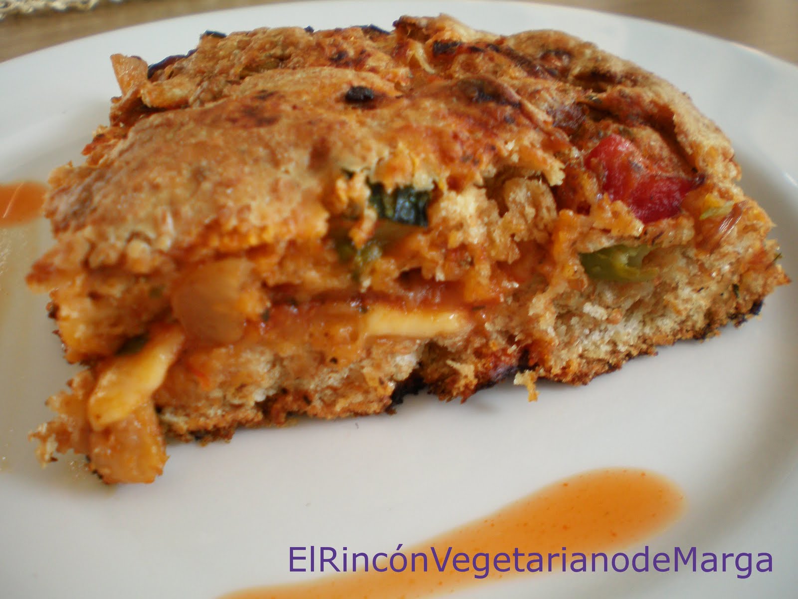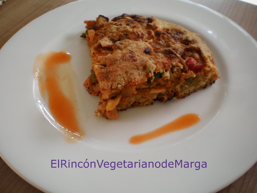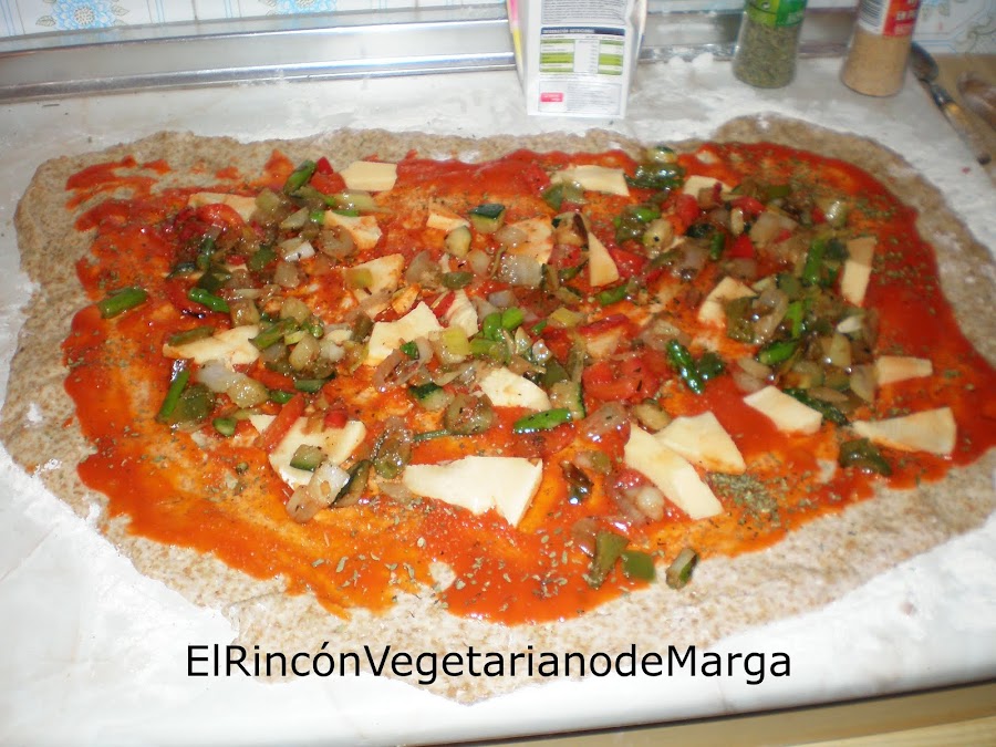 500 gr de harina integral, 25 gr. de levadura fresca, 1 vaso de agua tibia, un poco de miel, aceite de oliva, 5 espárragos verdes, 1 cebolla, 1 calabacín, 1 pimiento rojo grandecito, 1 pimiento verde de freir, tomate frito, queso tierno, sal, pimienta, orégano.