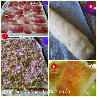 7.- Cubrir la masa con las lonchas de jamón serrano, el queso, el jamón york y las aceitunas.