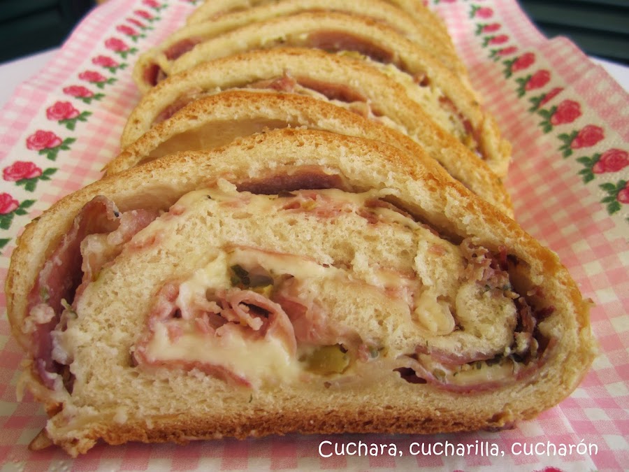 Una receta sencilla, adaptación del tradicional pan de leche que en casa tanto nos gusta (lo preparamos en una entrada anterior, aquí) con una presentación estupenda y perfecto para una comida/cena informal, para llevar a un picnic, y para compartir, ¡porque hay que ver lo que cunde este pan! Y además de estar riquísimo, hemos probado a congelarlo una vez cortado y ¡queda estupendo!. Así pues, no hay "peros" a este pan relleno, receta original de la web de Velocidad Cuchara.