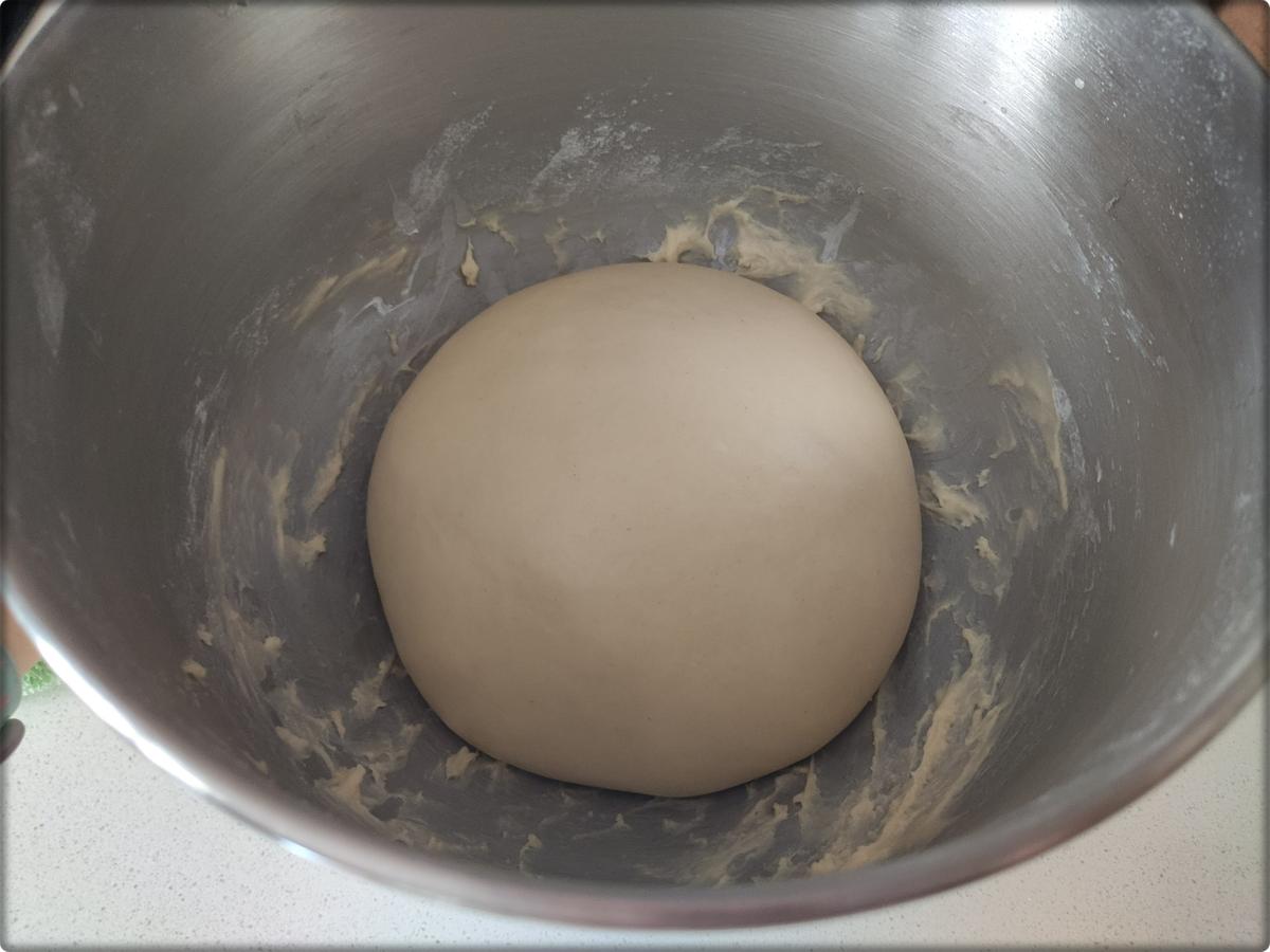 Usé la amasadora y la masa parecía estar siempre muy pegajosa, pero cuando la vi mas lisa la paré, me moje las manos con aceite de girasol y le di forma de bola. Después del levado sin embargo se manejaba muy bien y no se pegaba nada. Con esto quiero deciros que no caigáis en la tentación de ponerle harina sin parar, puede necesitar un poco mas porque depende del tamaño del huevo, de las distintas harinas, pero en ningún caso va necesitar muchísima mas. Yo le añadí una sola cucharada.