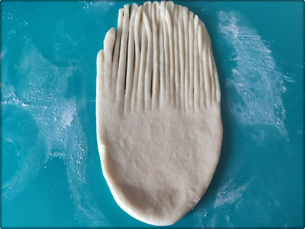 Pasado el tiempo de reposo estiramos cada pedazo de manera mas o menos rectangular y con la ayuda de un cuchillo vamos cortando la masa hasta la mitad (como veis en la foto), luego comenzáis a enrollarlos sobre si mismos empezando por el lado que no está cortado y los vamos colocando en un molde engrasado de unos 20 cm (el mío era de 18 cm).
