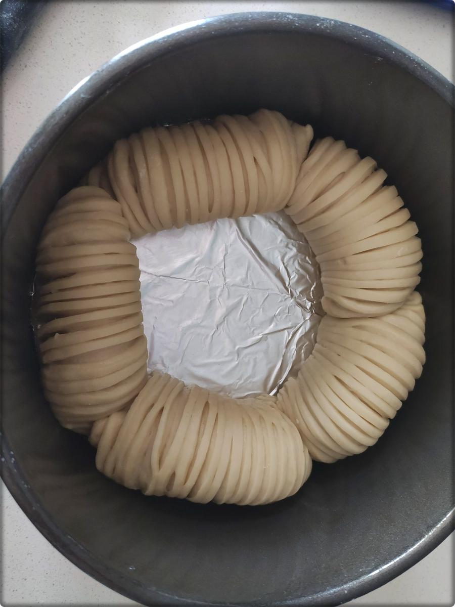 Hacemos un agujero en el centro de la harina y ponemos la nata (crema de leche) liquida, el huevo y la mezcla de leche y levadura. Amasamos hasta obtener una masa lisa. Formamos una bola y dejamos levar hasta que doble su volumen.