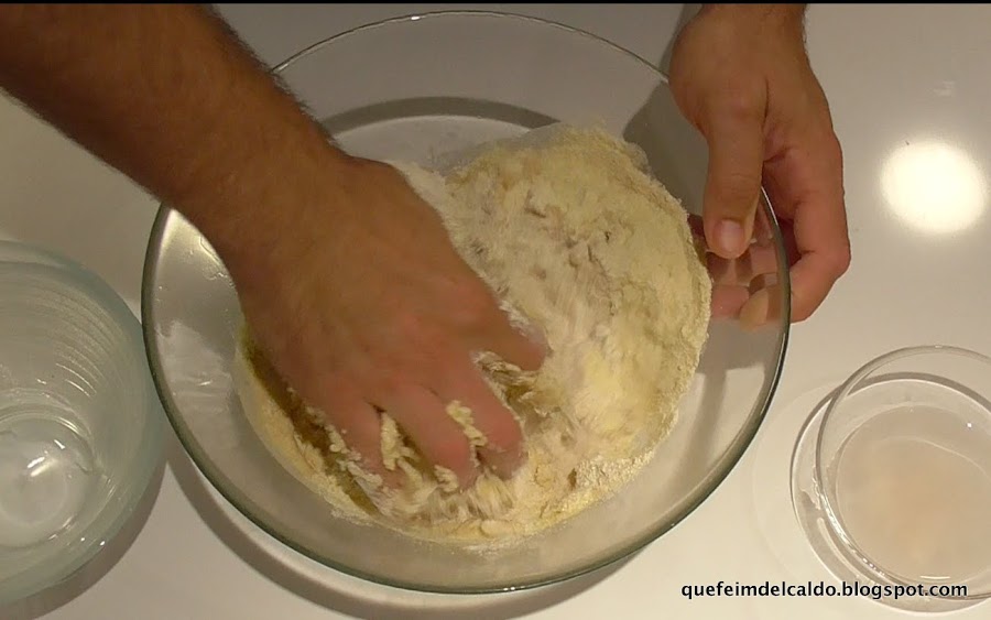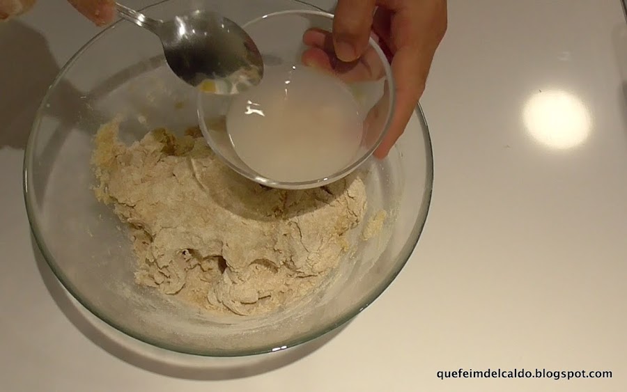 Transcurridos estos minutos de espera le añadimos el agua con la levadura.