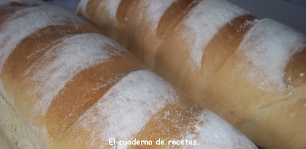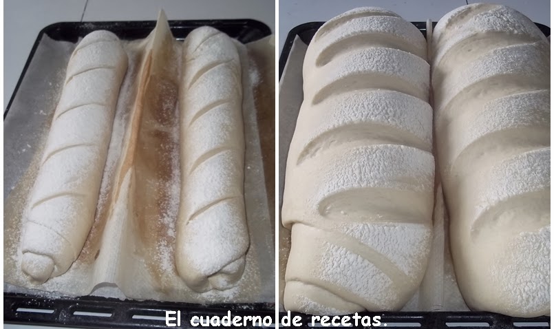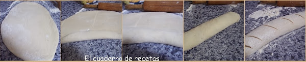 Introducimos todos los ingredientes en la cubeta, elegimos el programa de masas, que dura quince minutos, pasados diez minutos desde que termina el programa, sacamos la masa, dividimos en dos partes, le damos la forma { lo explico más abajo en fotos } dejamos las barras encima de la bandeja del horno, espolvoreamos con harina y hacemos los cortes con un cuchillo afilado o cuter. También hago un pliegue con el papel del horno entre los dos panes, para que no se peguen cuando se están haciendo.