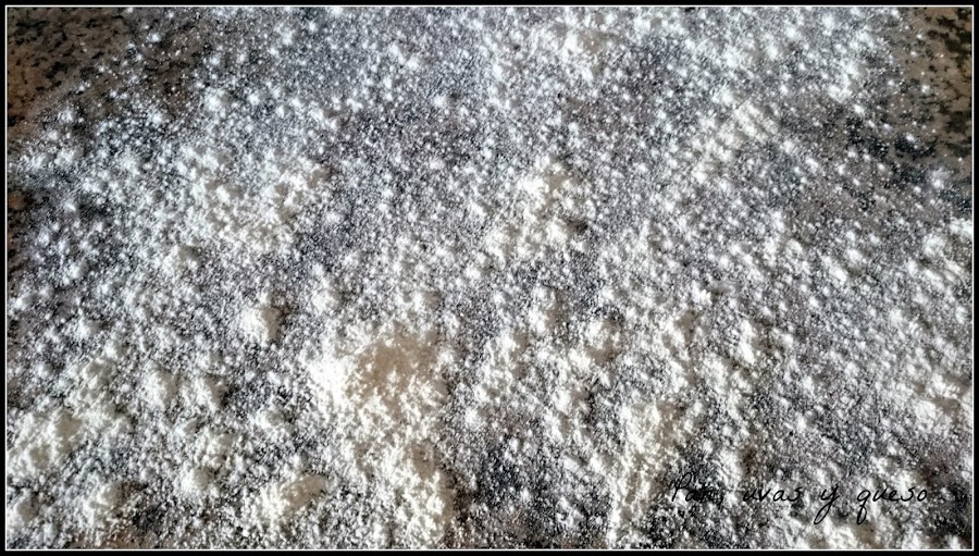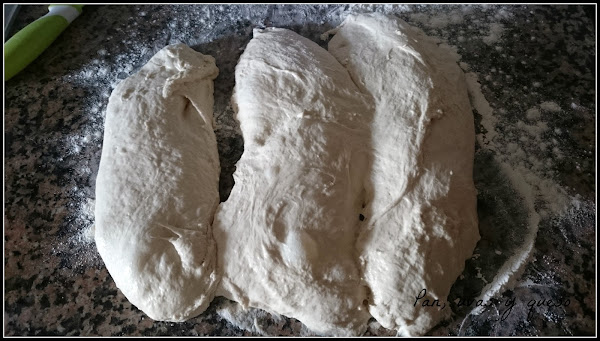 Una vez que nuestra masa está lista, espolvoreamos abundante harinasobre nuestra superficie de trabajo. Volcamos la masa sobre ella y la cortamos en 3 porciones rectangulares.