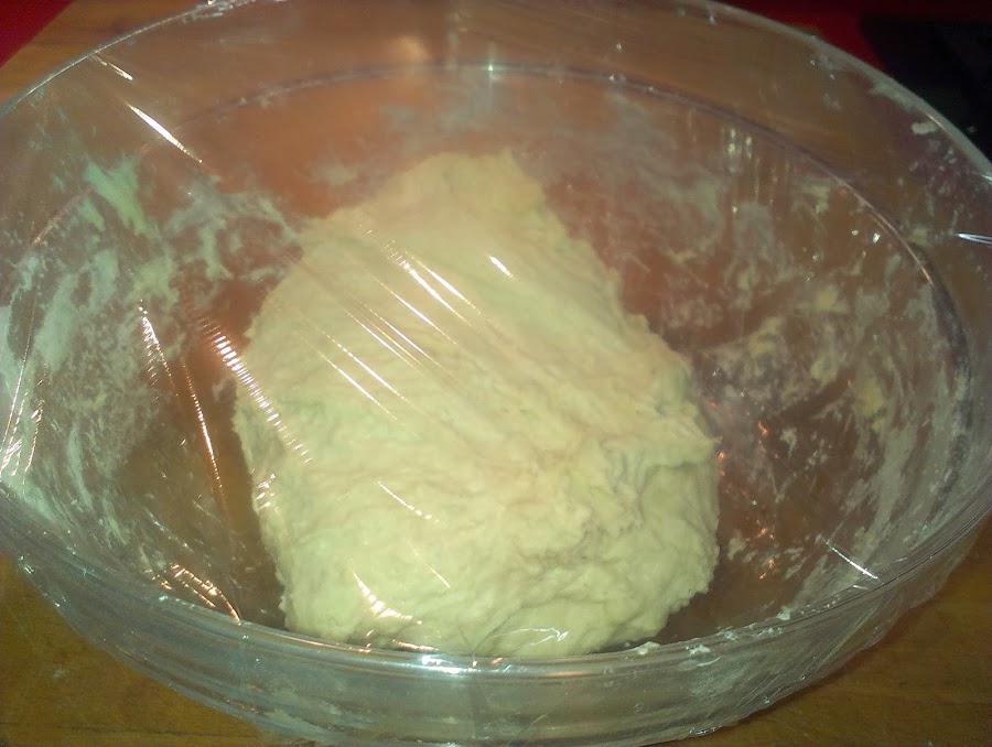 La masa quedará pegajosa ( es así). La dejamos reposar 5 minutos y luego la doblamos una vez sobre sí misma, estirándola con cuidado y doblándola. Cubrimos el bol con film transparente y la dejamos toda la noche en la nevera (yo preparé la masa a las 9 de la noche y la saqué de la nevera sobre las 9 de la mañana).