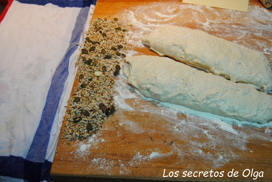 Ahora es el momento de formar los dos panes. Para ello pasamos las dos piezas por un trapo húmedo y luego por una capa de semillas, como se muestra en la siguiente imagen.