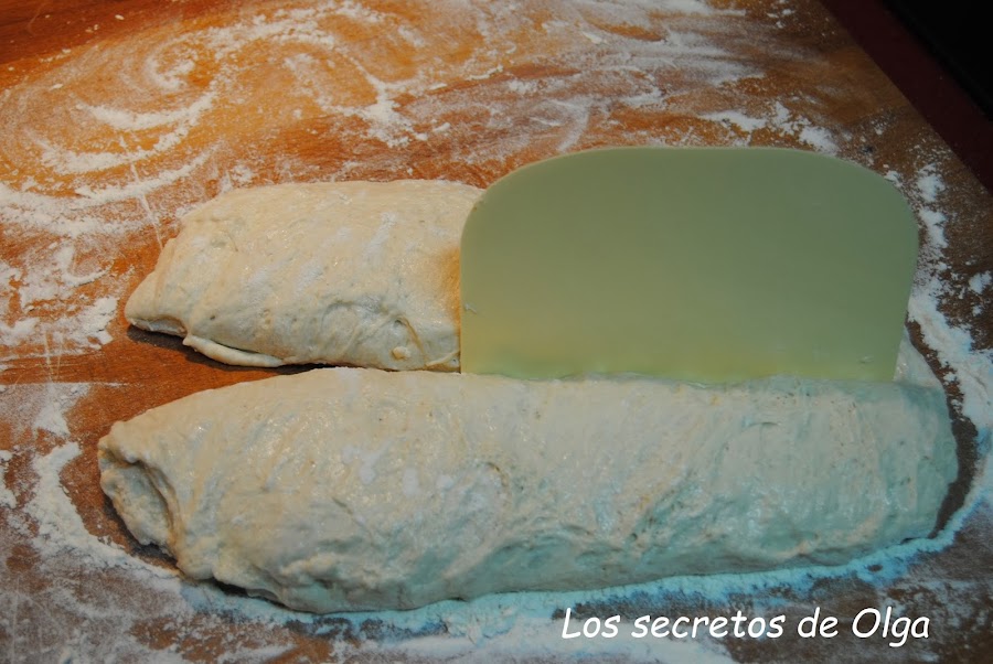 Con cuidado volcamos la masa sobre la mesa enharinada. Para ello nos podemos ayudar de una rasqueta. Y con delicadeza formamos un rectángulo. Cortamos dos piezas largas del mismo tamaño.