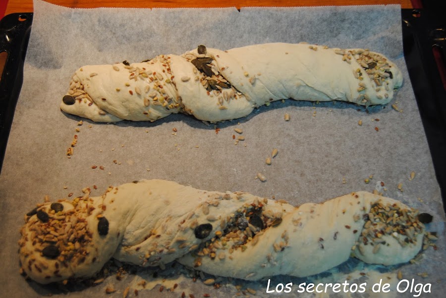 Con delicadeza retorcemos los panes hasta darle forma helicoidal ( a mi no me ha salido muy bien, pero hay que tener en cuenta que es la primera vez que la hago, ya le cogeré el truquillo). Las disponemos sobre papel de hornear en la bandeja del horno, con cierta distancia entre ellas y las dejamos fermentar unas 2 horas.