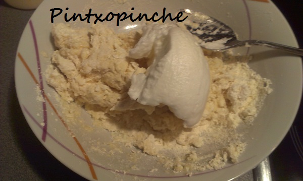 Mezclamos el agua con levadura y la harina, amasamos, cuando los ingredientes esté bien integrados incorporamos las claras montadas a punto de nieve. Mezclamos y amasamos unos 10 minutos.