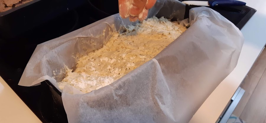 6.- Cuando esté bien mezclado todo, cogéis un molde tipo plumcake y lo forráis con papel vegetal.