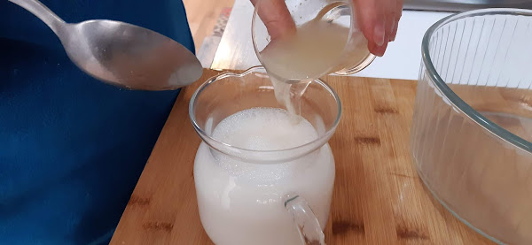 4.- Ahora vais añadiendo poco a poco la leche agria y la vais mezclando con una espátula o cuchara a la harina del bol.