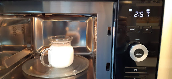 2.- La finalidad de este paso es conseguir que se haga una leche agria que, junto con el bicarbonato nos haga la finalidad de la levadura. Podéis hacer la leche agria con dos métodos. En el primero, añadís el zumo de limón a la leche y dejáis pasar de 10 a 15 minutos, hasta que la leche se corte, a temperatura ambiente. En el segundo (que es el que yo hice) metéis la leche en el microondas a máxima potencia 3 minutos y añadís el zumo de limón. Si no se hubiera cortado, ponerlo un minuto más.