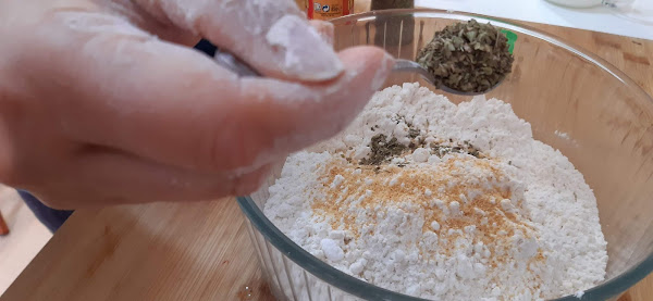 3.- Mientras en un bol ponéis la harina, el bicarbonato, la sal, el ajo y el orégano y lo mezcláis bien.
