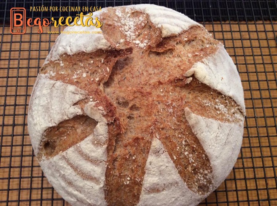A los 15 min bajamos la temperatura a 190ºC y lo dejamos 35 minutos más. Una vez acabado ese tiempo se apaga el horno y dejamos el pan dentro con la puerta entreabierta otros 10 min. Lo sacamos y lo ponemos en una rejilla. Dejar enfriar antes de cortar.