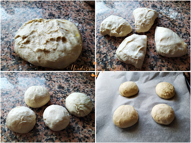 Pasado el reposo, pon la masa en la superficie enharinada y divide la masa por la mitad y luego cada trozo en otros dos trocitos. Si quieres hacer los panecillos más grandes, divide la masa en menos trozos.