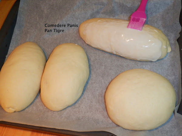Damos forma a los panes y colocamos sobre la bandeja de horno para que leven otra vez, os pincelamos con la mezcla de harina de arroz que teníamos reservada.