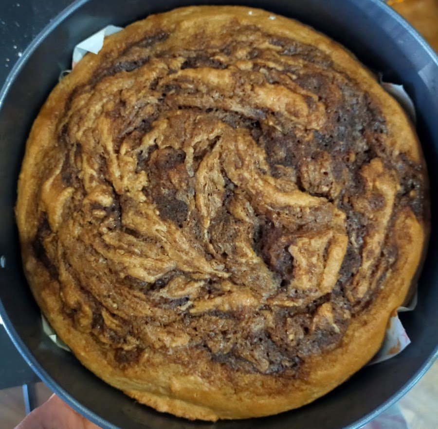 Cierne polvos y agrega líquidos e integra. Vierte la mezcla en un molde redondo de 22-24 cms preparado con papel para hornear en el fondo y engrasado.