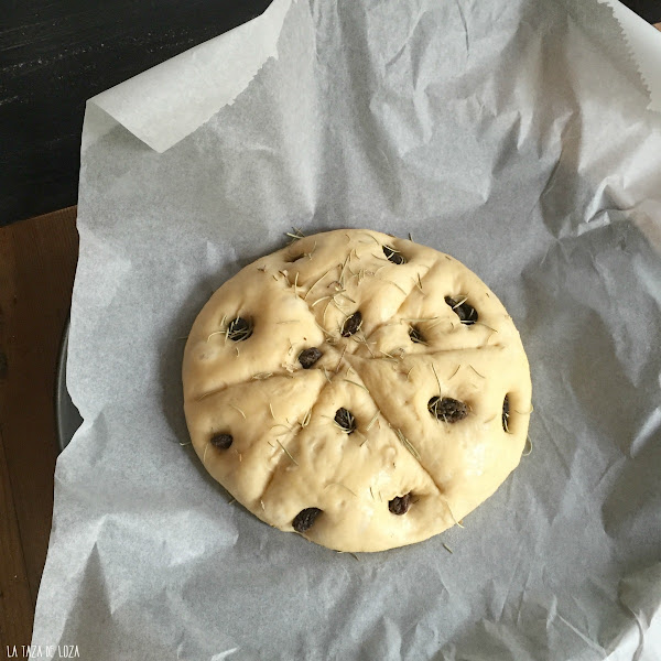 Las uvas las hundimos un poco con los dedos y el romero fresco se echa por la superficie del pan. Este pan se conoce con el nombre de pane di ramerino en dialecto de la Toscana, que en italiano significa rosmarino y que en español es romero.