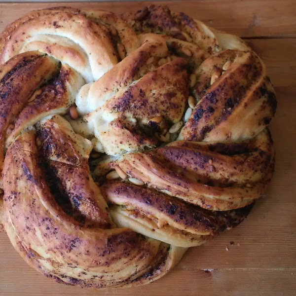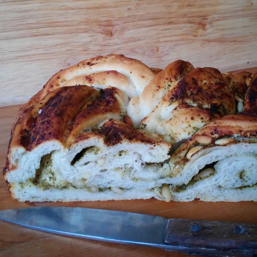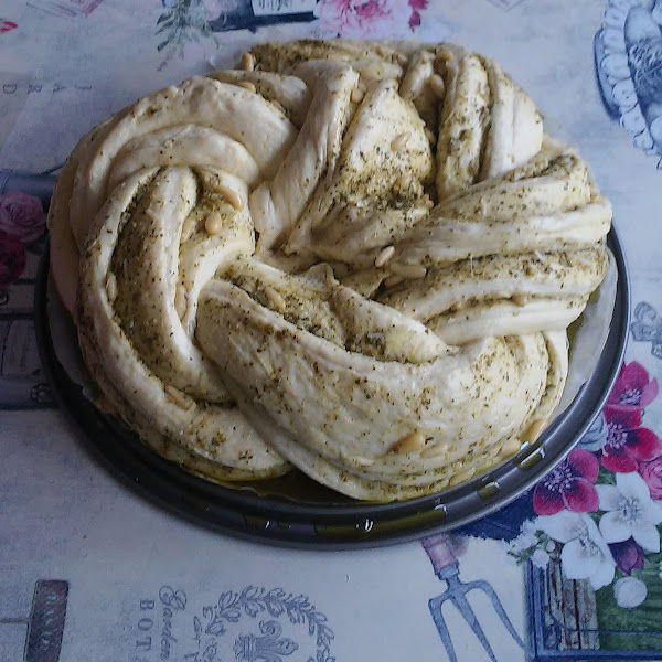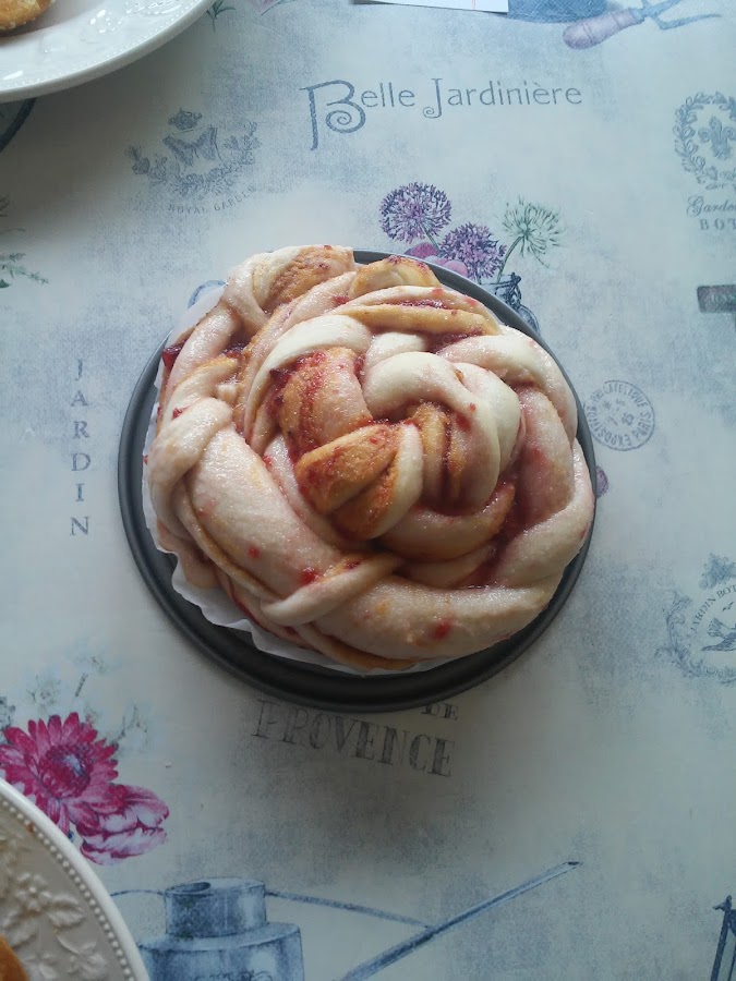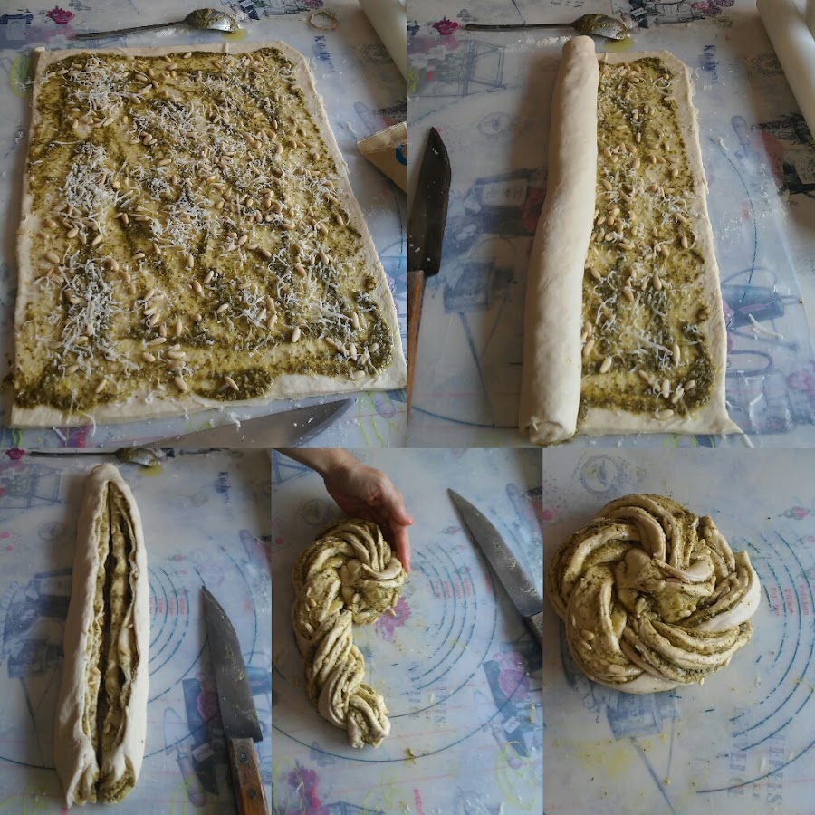 Los siguientes pasos son enrollar la masa extendida. Cortar por la mitad sin llegar al final. Trenzar.Volver a enrollar para crear un círculo.