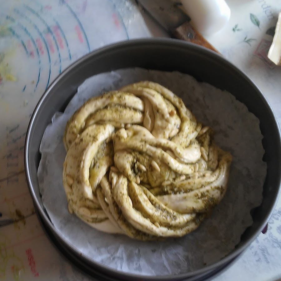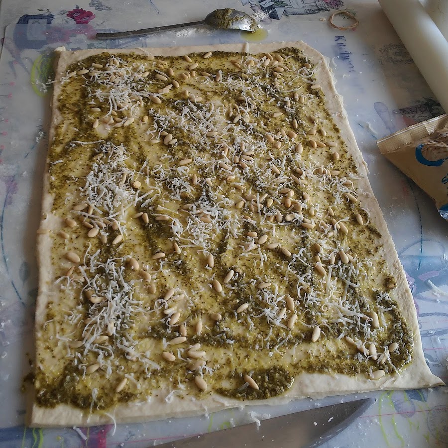 Estiramos la masa y cortamos los bordes para crear un rectángulo. Extendemos el pesto y le añadimos unos piñones enteros y más queso parmesano rallado.Y os dejo con la primera foto del experto cámara.