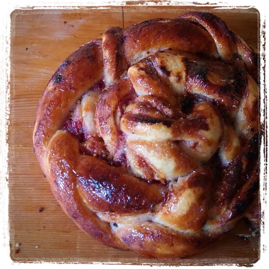 Como nos sobró masa al recortar los bordes hicimos otra trenza rellena de mantequilla de cacahuete y mermelada de fresa. Y de paso merendamos.