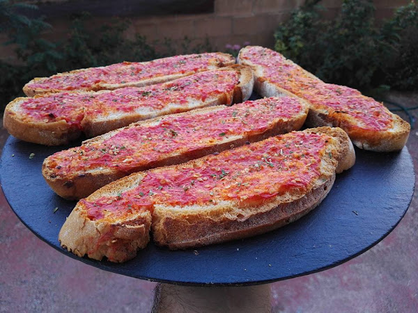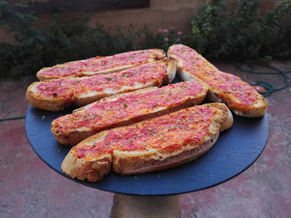 Mientras se dora el pan, rayamos los tomates y procuramos quitar el exceso de agua, le ponemos una pizca de sal y ponemos encima de las tostadas con ayuda de una cuchara, cuando tengamos todas con tomate volvemos a meter en el hora hasta que las tostadas queden con el tomate ya seco, sacamos y dejamos enfriar.