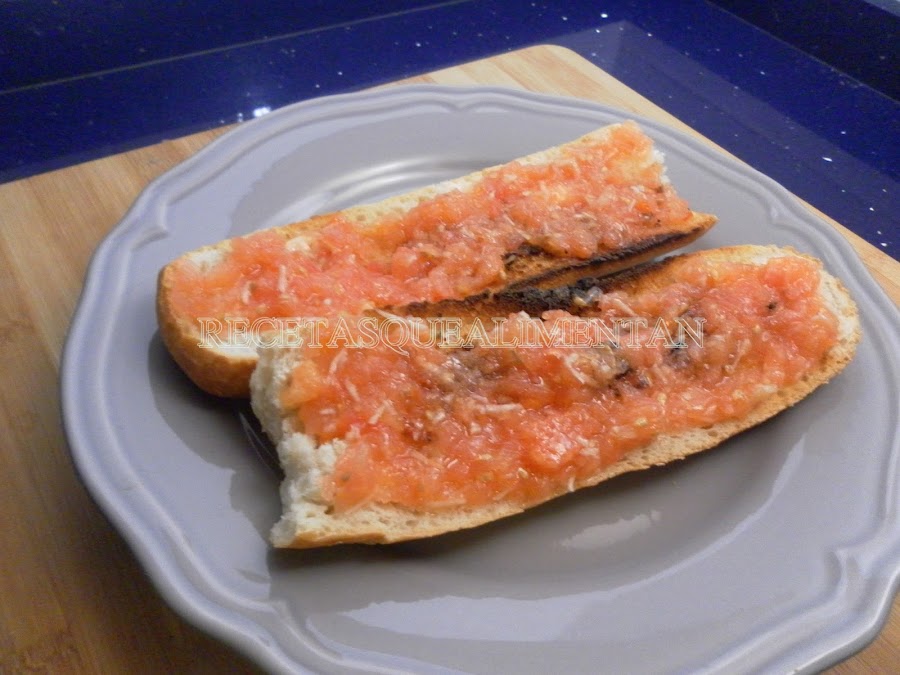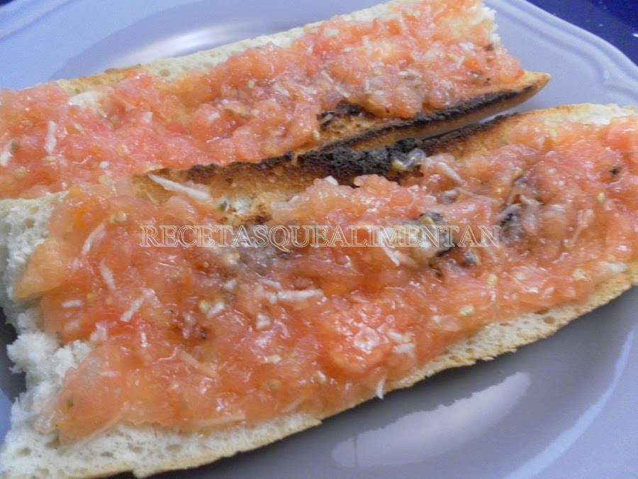 Nota: en lugar de mezclar los ingredientes, podemos rociar el pan con aceite en primer lugar, seguidamente los dientes de ajo rallados, el tomate y sazonar.