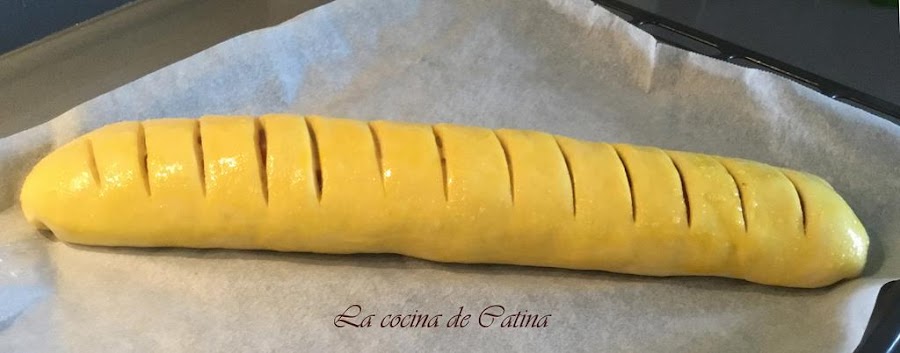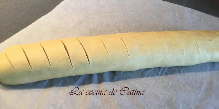 Enrollamos la masa sellando bien los bordes para que no se nos salga el relleno. En este punto le hice marcas a la barra de pan para cortarla luego en rebanadas de una forma mejor.