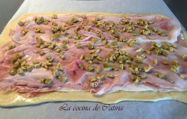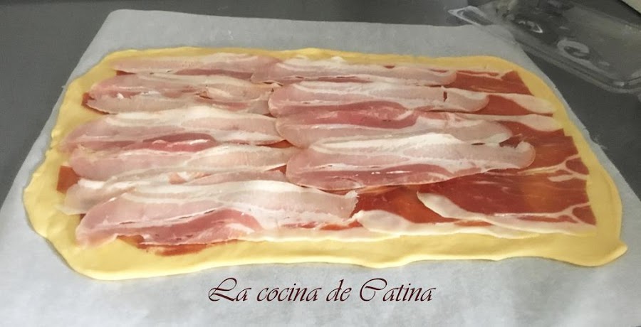 Ahora vamos poniendo sobre la superficie de la masa primero las lonchas de jamón serrano, seguidas de las de bacon y después las de jamón york. Sobre ellas repartimos las aceitunas escurridas y picadas.