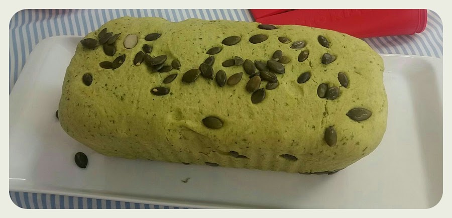 3.- Aplasta la masa, reparte la mitad de las semillas de calabaza y forma una bola. Aplasta ligeramente la masa dobla un tercio sobre si misma y presiona la union con los dedos. Vuelve a doblar en el mismo sentido y sella a pellizcos la union para formar un cilindro. Colocalo dentro del molde reservado , pinta la superficie con aceite y espolvorea el resto de las semillas de calabaza. Ponle tapa al molde o envuelvelo bien con papel aluminio. Deja reposar 1 hora deltro del varoma.