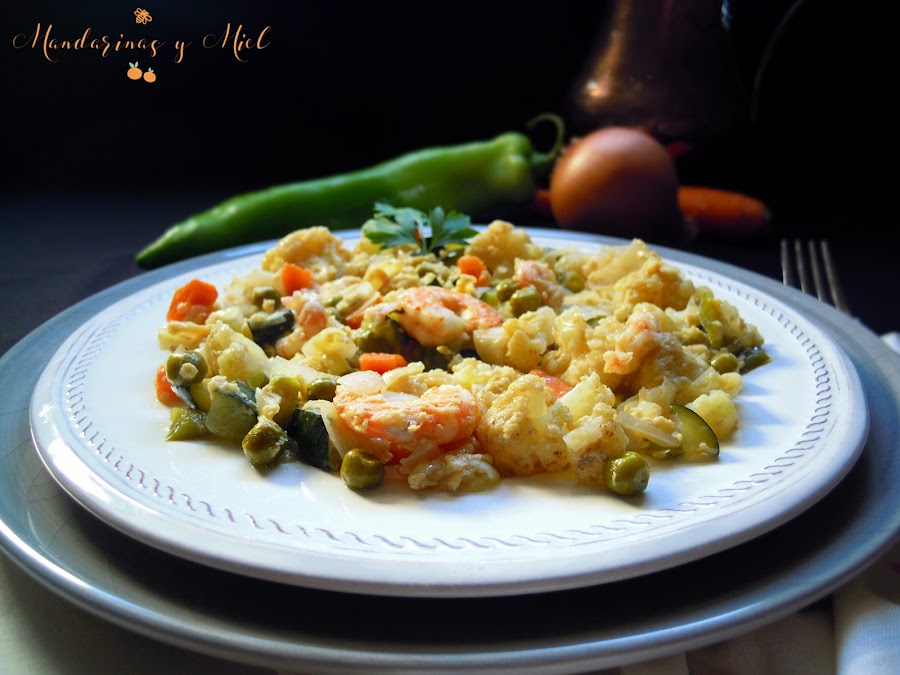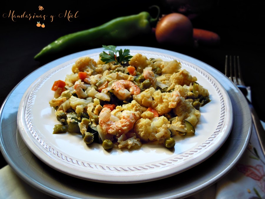 Pasado el tiempo y veas que las verduras están cocidas, quita el film del recipiente y añade las gambas peladas y los huevos batidos, remueve y vuelve a poner en el microondas durante unos 10 minutos más.