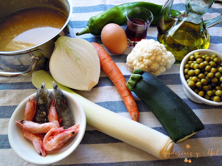 Mirando los cajones del congelador, también vi que tenía unas gambitas y unos langostinos que me sobraron de hacer una ensaladilla rusa de marisco, también tenía unos guisantes congelados y un táper de caldo.....pues todo va para la panaché!!