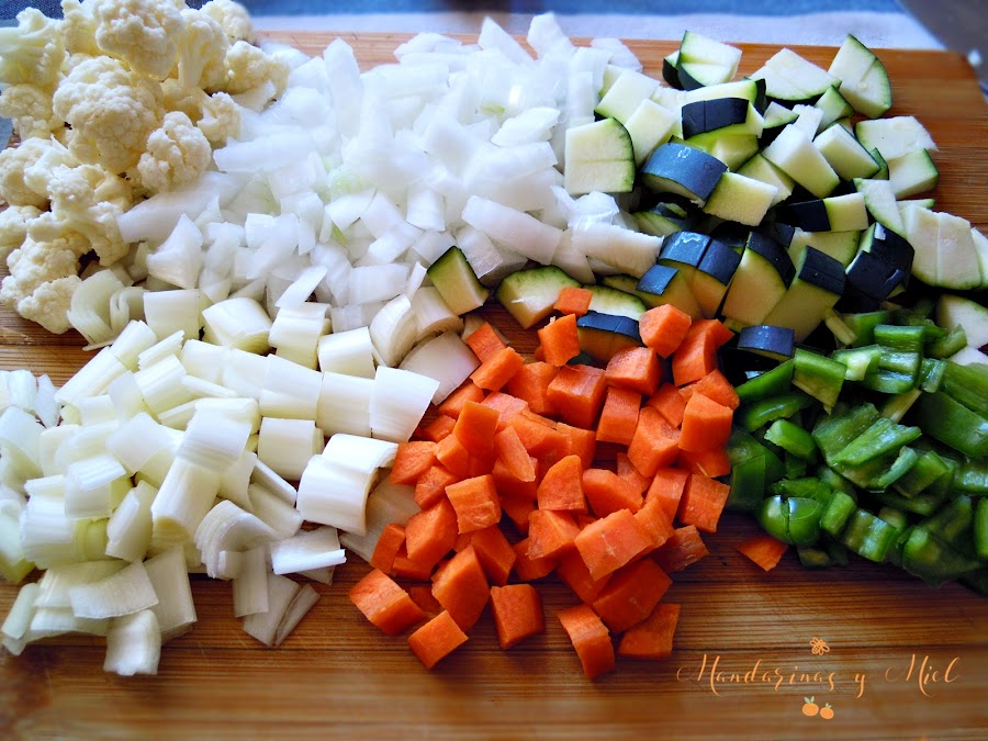 Esta vez tenía un pimiento verde, media cebolla, una zanahoria que ya estaba bastante mustia, medio calabacín, un trozo de puerro y otro de coliflor.