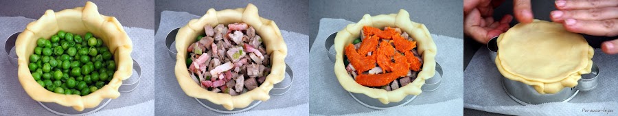Poner en el fondo una capa de guisantes, cubrir con una capa de la mezcla de carne y finalizar colocando por encima unos trozos de sobrasada.