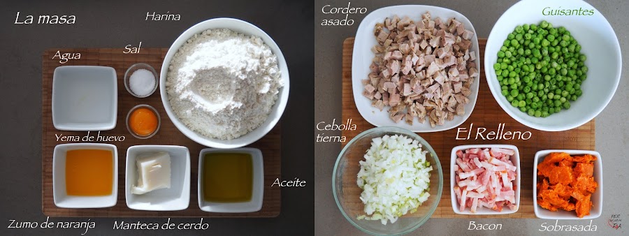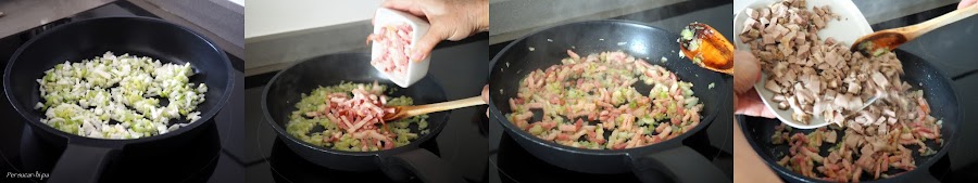 Picar una cebolla mediana y pocharla con un poco de aceite. Cuando esté tierna, añadirle el bacon troceado y freír hasta que el bacon esté ligeramente dorado. Incorporar el cordero y remover para que se integren todos los sabores. Retirar del fuego y reservar.