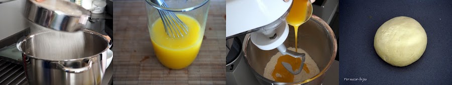 Mezclar todos los ingredientes líquidos, ligeramente calientes. Tamizar la harina sobre un bol e incorporar la mezcla líquida, remover hasta conseguir que todos los ingredientes estén bien mezclados, amasar ligeramente y hacer una bola, cubrirla con papel film y dejar reposar. Mientras preparar el relleno.