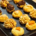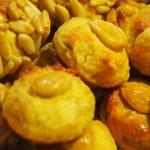 Adornamos cada bolita con media nuez, una almendra, un trocito de naranja confitada……y pincelamos todas ellas con huevo batido. Introducimos la placa en el horno a 200 ºC y estamos pendientes de la evolución, se hacen muy rápido. El momento de sacarlos es cuando están dorados. No intentar moverlos de la bandeja de horno hasta que no estén tibios porque acaban de adquirir consistencia mientras se enfrían.