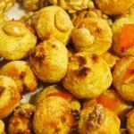 Formamos bolitas con la masa ayudándonos de dos cucharillas y algunas las rebozamos en piñones. Las otras las vamos colocando sobre una placa de horno cubierta con un papel de hornear un poco separadas unas de otras pues, aunque no mucho, la masa crece.