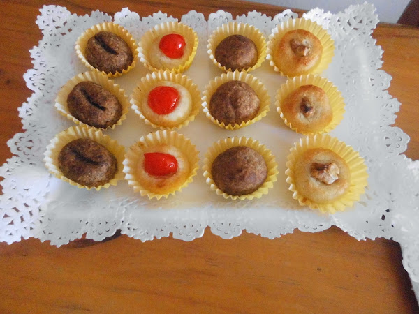 Como veis hay que tener un poco de imaginación, para los de café y chocolate mezclamos la masa con un poco de café o chocolate, para el de piñones o almendra los bañamos en huevo batido y lo rebozamos con los piñones y almendra y los de cereza y nuez solo les tenemos que poner encima y pintarlos con huevo batido, se hornean hasta que se doren y listo!