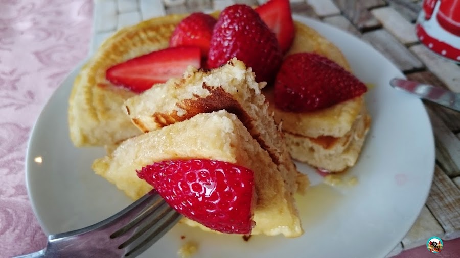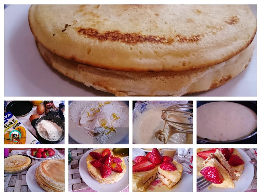3.- Servimos los pancakes calientes con las fresas frescas, lavadas y cortadas en laminas con unas cucharadas de miel por encima. También los podemos servir con unas bolas de helado y sirope de chocolate o caramelo.