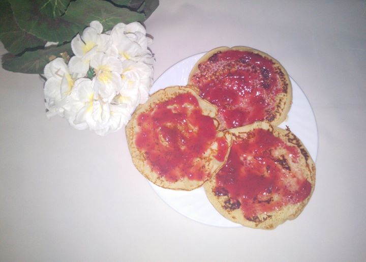 Licuar la leche,mantequilla derretida,huevos,azúcar,vainilla,harina,polvo de hornear y sal ya bien licuado verter un cuarto taza de la mezcla a un sartén mediano caliente con aceite en spray o con mantequilla dejar burbujear luego voltear y dejar dorar ligeramente,una vez listas servir calientes con la mermelada elejida.