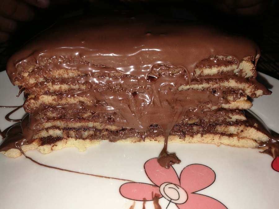 Mientras vamos colocando las tortillas en un plato, vamos añadiendo nutella en cada una y colocando una encima de otra. A la ultima tortilla añadí nutella (que calenté un poco en el microondas).