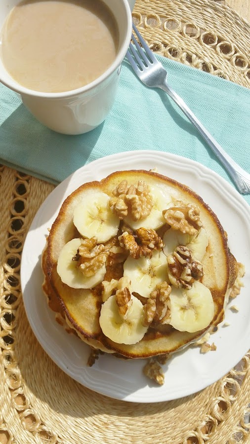 Uno de nuestros platillos favoritos son estos Pancakes de Banana con walnuts, a mis hijos les encanta acompañarlos con un delicioso y refrescante vaso de Nestlé Nesquik, yo lo prefiero con una buena taza de NESCAFÉ Tasters Choice House Blend, endulzado con Nestlé Coffee-mate Natural Bliss Sweet Cream.