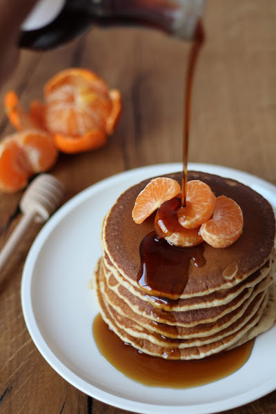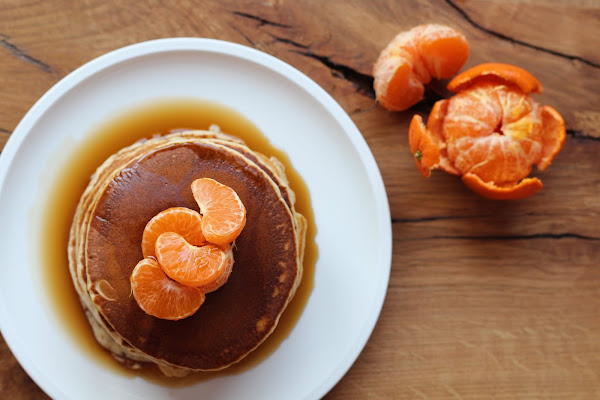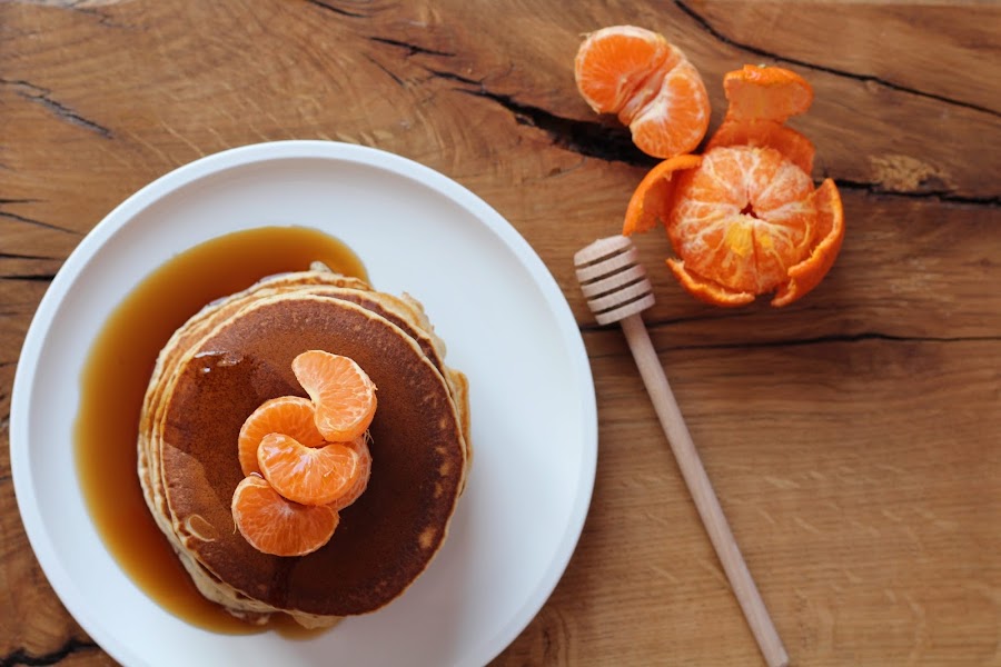 Emplatamos las 6 tortitas juntas, colocamos unos gajos de mandarina encima. Vertemos un poco de sirope de arce por encima y a disfrutar.