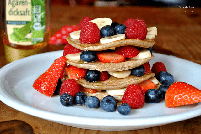 Para el montaje poner una tortita en un plato, cubrirla de fruta variada y repetir la misma operación tantas veces como quieras. Terminar rociando por encima con el sirope de Agave.